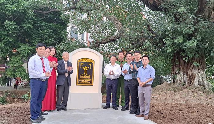 GS.TSKH Đặng Huy Huỳnh (bìa trái thứ hai) trao Bằng công nhận Cây Di sản Việt Nam cho đại diện chính quyền địa phương. Ảnh: VACNE