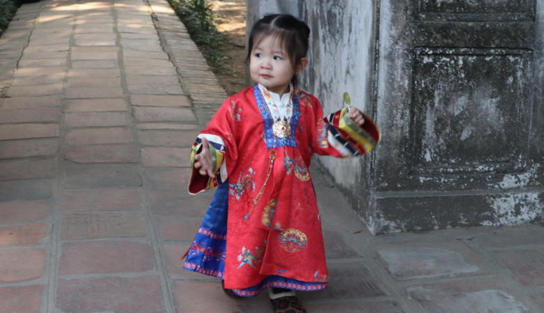 Không chỉ người lớn, nhiều gia đình còn lựa chọn mặc áo dài, Việt phục cho trẻ nhỏ khi đưa con đi chụp ảnh, tham quan. Những bộ trang phục truyền thống nhiều màu sắc trên các em bé xuất hiện giữa dòng người đông đúc, tạo nên hình ảnh Tết gần gũi, báo hiệu mùa xuân đang hiện diện trong từng khoảnh khắc đời thường.