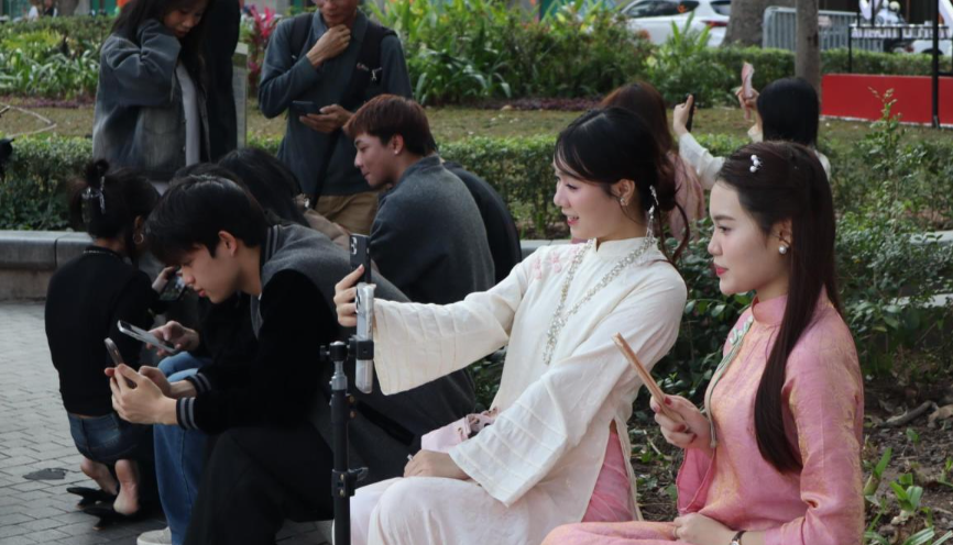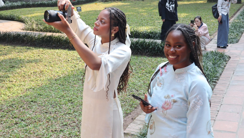Du khách nước ngoài trải nghiệm mặc áo dài Việt Nam và chụp ảnh tại Văn Miếu – Quốc Tử Giám, tạo nên hình ảnh giao thoa văn hóa giữa không khí du xuân sớm. “Đây là lần đầu tôi mặc áo dài. Trang phục rất đẹp, nhẹ và mang lại cho tôi cảm giác được kết nối với văn hóa Việt Nam, đặc biệt trong những ngày chuẩn bị đón năm mới,” một du khách chia sẻ.