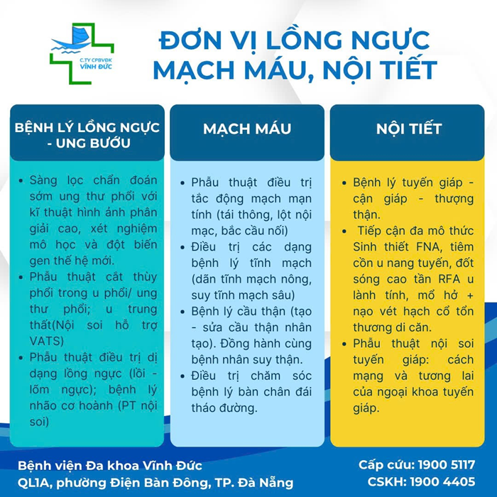 Bệnh viện Đa khoa Vĩnh Đức (TP. Đà Nẵng), với các kỹ thuật nổi bật như sàng lọc ung thư phổi thế hệ mới, điều trị bệnh lý mạch máu bằng phương pháp ít xâm lấn và phẫu thuật nội soi tuyến giáp hiện đại.