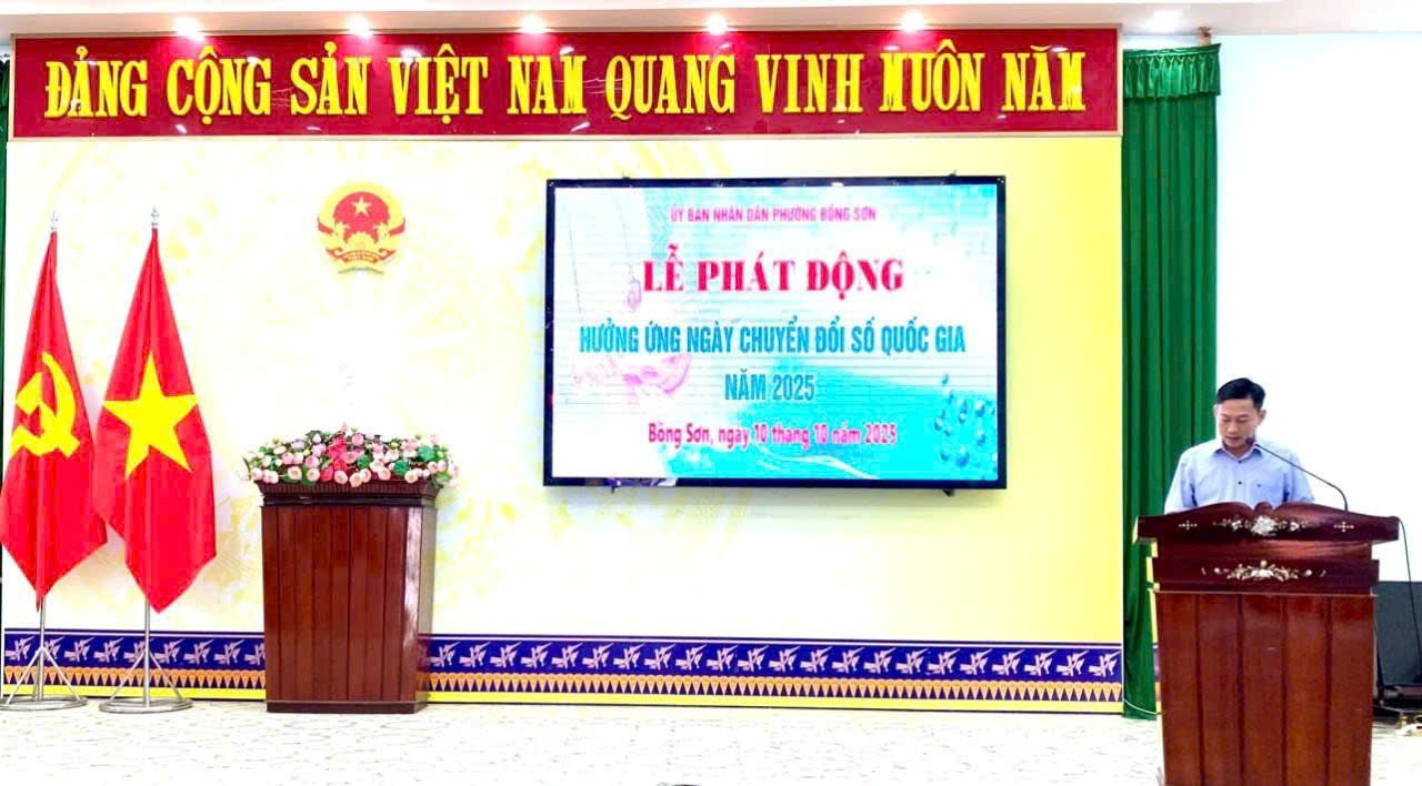 Trước đó, sáng 10/10, UBND phường Bồng Sơn đã tổ chức Lễ phát động hưởng ứng Ngày Chuyển đổi số Quốc gia. Tại Lễ phát động, ông Trương Nam Phong, Chủ tịch UBND phường nhấn mạnh: "Chuyển đổi số không chỉ là xu hướng tất yếu mà còn là cơ hội để phường Bồng Sơn phát triển nhanh hơn, hiệu quả hơn, gần dân hơn. Mỗi cán bộ, công chức, đoàn viên và người dân chính là một "công dân số". Ngay sau lễ phát động, phường Bồng Sơn tổ chức ra quân hướng dẫn người dân thực hành chuyển đổi số, triển khai đồng loạt tại 21 khu phố.