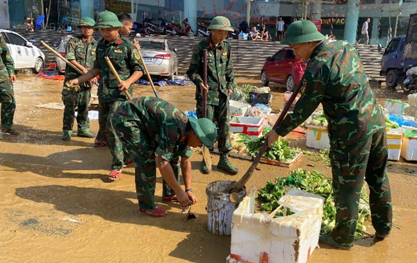 Lực lượng chức năng hỗ trợ người dân dọn dẹp sau mưa lũ.