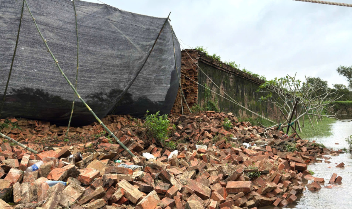 Mưa lũ kéo dài nhiều ngày khiến đoạn tường Hoàng thành Huế dài gần 15 mét bị đổ sập. (Ảnh: GX).