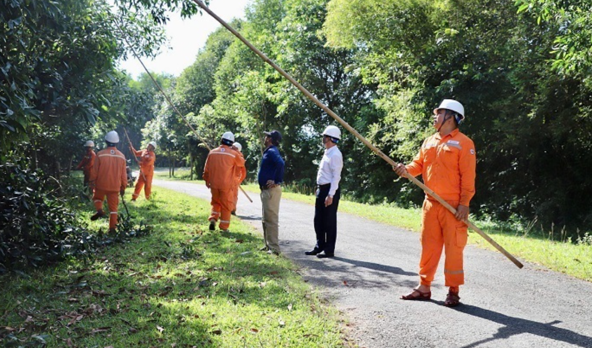 Công nhân Điện lực Hà Tĩnh phát quang hành lang an toàn lưới điện. (Ảnh: CT).