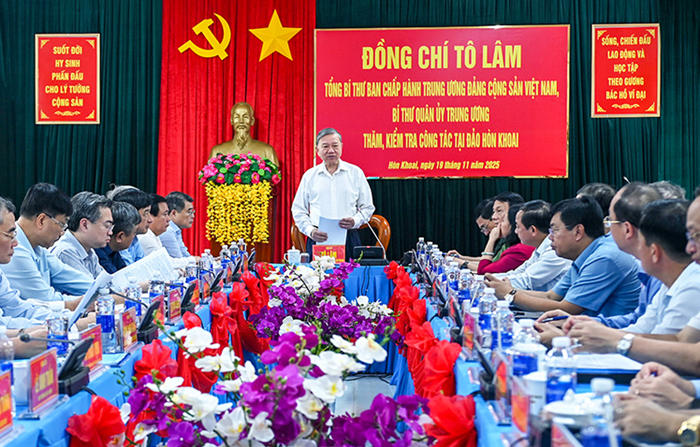 Tổng Bí thư đề nghị, toàn bộ lực lượng trên công trường phải quán triệt tinh thần Hòn Khoai là trọng điểm chiến lược quốc gia; cảng biển và cầu vượt biển không chỉ phục vụ dân sinh, kinh tế, mà còn là tuyến trụ quốc phòng - an ninh ở cực Nam Tổ quốc. Vì vậy, tiến độ nơi đây không phải tiến độ của một dự án, mà là tiến độ của niềm tin nhân dân, uy tín Nhà nước và trách nhiệm với tương lai đất nước; không chậm một giờ, không lùi một bước, không để bất kỳ mắt xích nào làm trì trệ tiến độ chung.