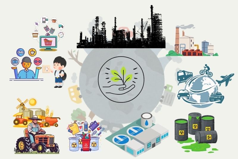 Các nguồn phát thải tạo ra "dấu chân carbon" bao gồm: Phát thải trực tiếp (Phạm vi 1): Phát thải từ các nguồn thuộc sở hữu hoặc kiểm soát trực tiếp của đối tượng, ví dụ như việc đốt nhiên liệu trong xe ô-tô cá nhân, lò sưởi của gia đình, hoặc phát thải từ các quy trình sản xuất của một nhà máy.