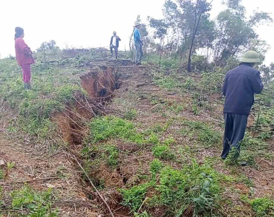 Theo đó, vào chiều 15/11, khi đang dọn khối lượng đất từ mái taluy dương tràn xuống tuyến đường giao thông trục xã bị sạt lở sau mưa lớn, người dân bất ngờ khi phát hiện trên ngọn đồi phía trên đã bị nứt, sụt lún nghiêm trọng. Ngay sau đó, họ đã báo với chính quyền địa phương để có phương án xử lý.