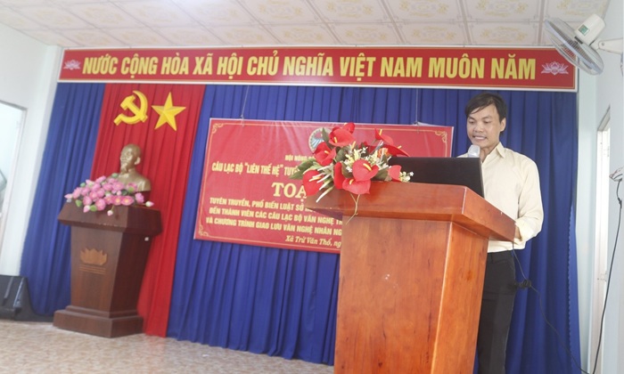 TMO - Vừa qua, Hội Nông dân xã Trừ Văn Thố (TP. HCM) phối hợp cùng Câu lạc bộ “Liên Thế Hệ” tuyên truyền pháp luật và ca khúc cách mạng tổ chức chương trình tọa đàm tuyên truyền, phổ biến Luật Sở hữu trí tuệ về quyền tác giả, tác phẩm kết hợp giao lưu văn nghệ, thu hút đông đảo hội viên Hội Nông dân xã, thành viên các câu lạc bộ, nhóm văn nghệ tham dự.