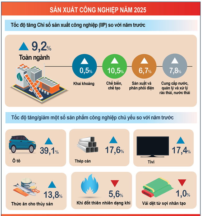TMO – Đóng góp vào tăng trưởng chung, ngành chế biến, chế tạo tăng 10,5%, đóng góp 8,4 điểm phần trăm vào mức tăng chung; ngành sản xuất và phân phối điện tăng 6,7%, đóng góp 0,6 điểm phần trăm; ngành cung cấp nước, hoạt động quản lý và xử lý rác thải, nước thải tăng 7,8% và ngành khai khoáng tăng 0,5%, cùng đóng góp 0,1 điểm phần trăm (số liệu từ Cục Thống kê, Bộ Tài chính).