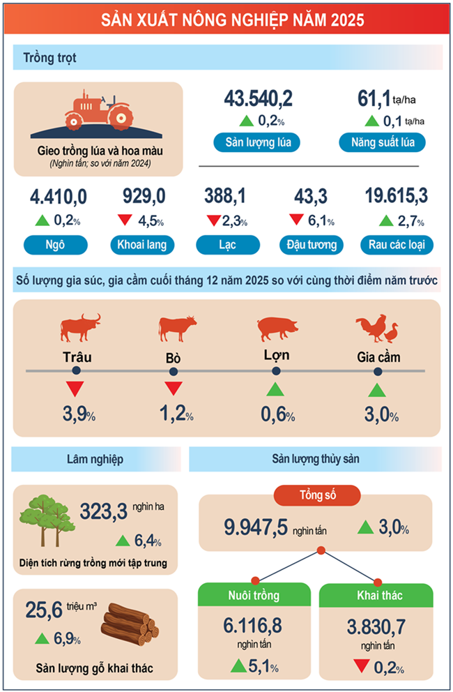 TMO - Sản xuất nông nghiệp năm 2025 ghi nhận kết quả tích cực với sự chủ động phòng chống, ứng phó và hỗ trợ kịp thời của các cấp, các ngành, các địa phương trước ảnh hưởng của thiên tai, bão lũ và dịch tả lợn châu Phi bùng phát trên diện rộng (theo Cục Thống kê, Bộ Tài chính).