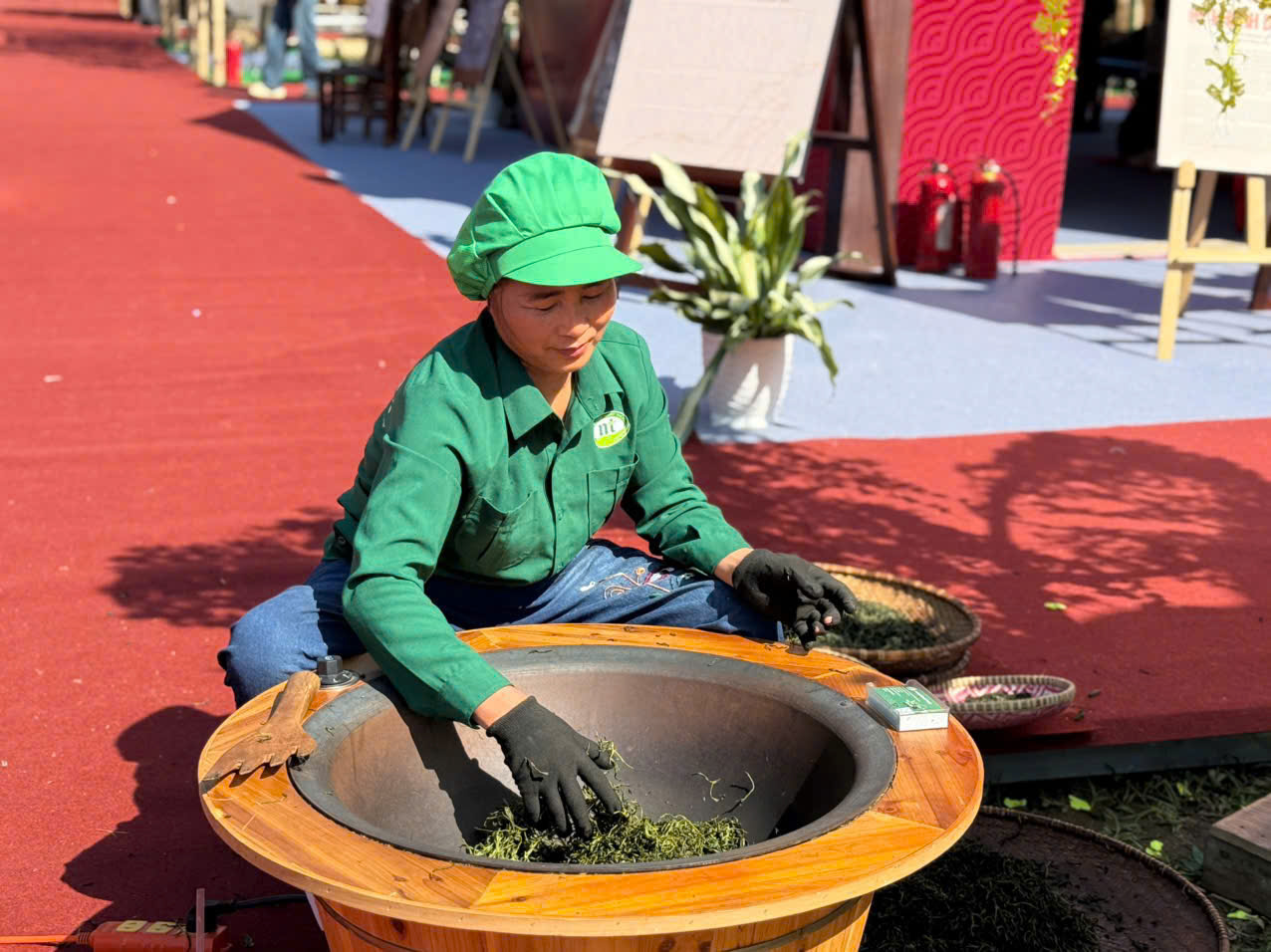 Tại gian hàng chè Thái Nguyên du khách có cơ hội theo dõi trực tiếp công đoạn sao chè, khâu quan trọng quyết định hương thơm và chất lượng chè.