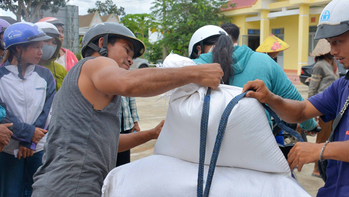 Cấp phát gạo không thu tiền cho người dân vùng bị ảnh hưởng nặng bởi thiên tai, dịch bệnh.