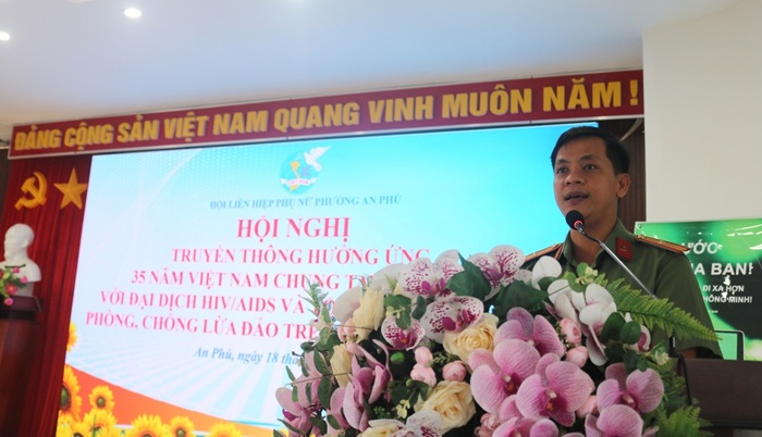 Thiếu tá Lê Mạnh Cường – Phó trưởng Công an phường tuyên truyền kiến thức về phòng chống HIV/AIDS và tội mua bán người, lừa đảo trên không gian mạng.