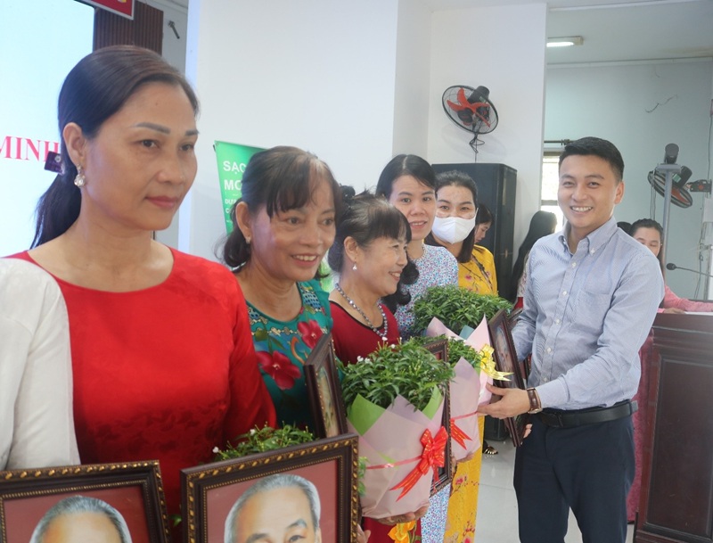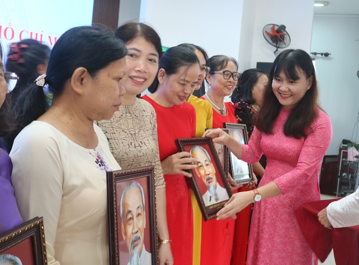 Lãnh đạo phường, đơn vị đồng hành tặng ảnh Bác Hồ và cây xanh cho Hội viên phụ nữ phường.
