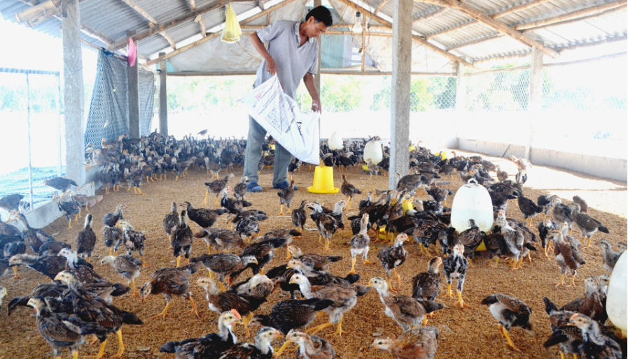 Nông dân Quảng Ninh nuôi gà trên đệm lót sinh học, góp phần bảo vệ môi trường, giảm mùi hôi. (Ảnh: VQ).