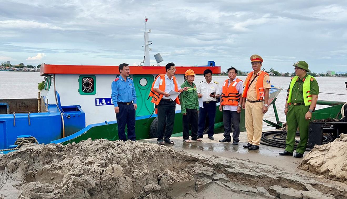 Lực lượng chức năng kiểm tra hoạt động khai thác cát trên địa bàn. (Ảnh: BTT).
