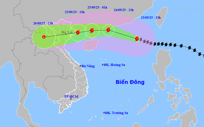 Theo Trung tâm Dự báo khí tượng thủy văn quốc gia, sáng 23/9, vị trí tâm bão Ragasa cách bán đảo Lôi Châu (Trung Quốc) khoảng 840 km về phía Đông. Sức gió mạnh nhất cấp 17, giật trên cấp 17. Dự báo: trong những giờ tới, bão di chuyển theo hướng Tây Tây Bắc, tốc độ khoảng 20 km/h.