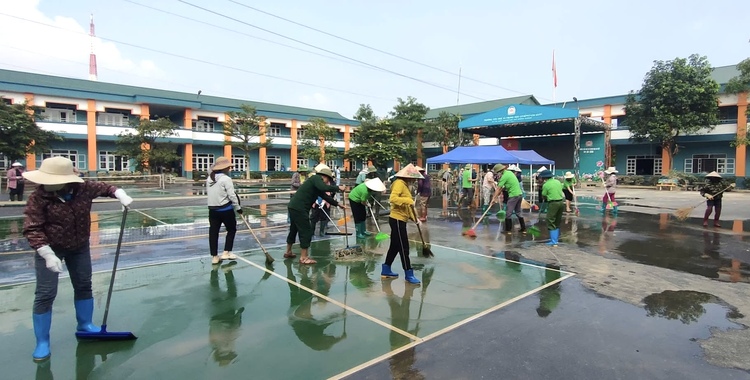 Tuy nhiên, để hỗ trợ người dân sớm ổn định cuộc sống, không ngại vất vả, lực lượng đoàn viên, hội viên và cán bộ MTTQ xã đã khẩn trương ra quân từ sáng sớm, mang theo cuốc, xẻng, chổi, bao tải… để dọn rác, khơi thông cống rãnh, nạo vét bùn, trả lại cảnh quan sạch đẹp cho từng con đường cũng như sân trường.