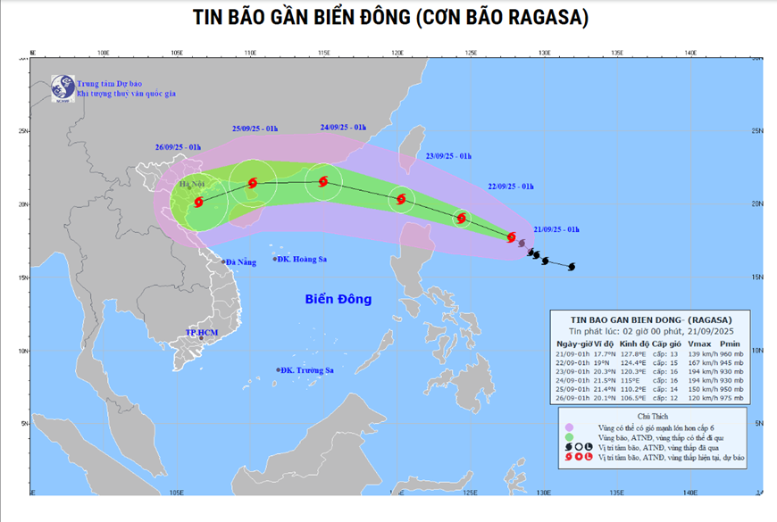 TMO - Theo Trung tâm Dự báo khí tượng thủy văn quốc gia, hôm nay (ngày 21-9) khu vực Bắc Bộ ngày nắng, đêm mưa to. Trên biển, vào hồi 1 giờ, tâm bão RAGASA ở khoảng 17,7 độ Vĩ Bắc, 127,8 độ Kinh Đông, cách đảo Luzon (Philippines) khoảng 600km về phía Đông.