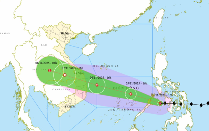 Theo Trung tâm dự báo khí tượng thủy văn quốc gia, bão Kalmaegi đang di chuyển theo hướng Tây Tây Bắc, sáng mai 5/11 bão sẽ di chuyển vào khu vực Biển Đông, trở thành cơn bão thứ 13 trong năm 2025. Sau khi vào Biển Đông bão tiếp tục mạnh lên cấp 13-14, giật cấp 16-17, di chuyển hướng về vùng biển và đất liền khu vực Trung và Nam Trung Bộ. Bão có thể đạt tới cấp 13-14, giật cấp 16-17 ở đặc khu Trường Sa (Khánh Hòa) và trên vùng biển ngoài khơi từ Đà Nẵng đến Khánh Hòa; cấp 12-13, giật trên cấp 15 trên vùng biển ven bờ (bao gồm đặc khu Lý Sơn).
