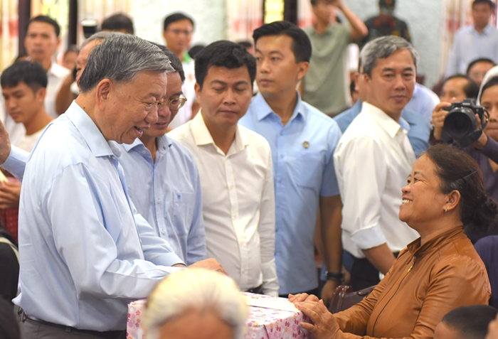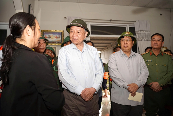 Tổng Bí thư Tô Lâm thăm, động viên người dân vùng ảnh hưởng mưa lũ sớm vượt qua khó khăn. Ảnh: BH