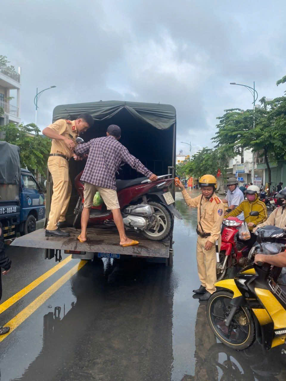 Cảnh sát giao thông tích cực giúp người dân di chuyển qua vùng ngập lụt.