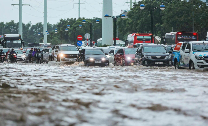 Phương tiện di chuyển khó khăn do đường bị ngập sâu.