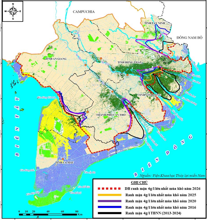 Nhận định ranh xâm nhập mặn 4g/l lớn nhất mùa khô 2025-2026 vùng ĐBSCL. (Tỷ lệ 1/1.500.000).