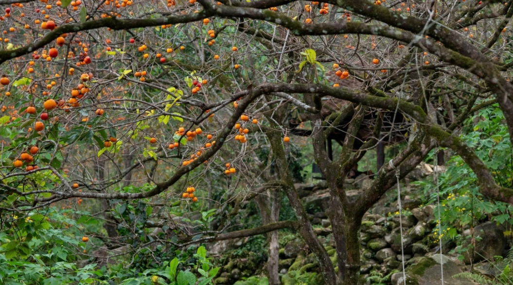 Thân cây xù xì, rêu phong phủ kín, cành vươn rộng tạo thành những tán lớn, mỗi độ thu về lại trĩu nặng quả. Khi lá bắt đầu ngả vàng và rụng dần, cả khu vườn hiện lên với vẻ đẹp mộc mạc, cuốn hút với những chùm hồng chín đỏ cam nổi bật trên nền trời xanh nhạt, gợi cảm giác yên bình, hoài niệm.