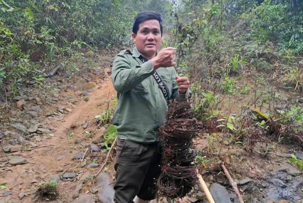 Lực lượng Kiểm lâm tháo gỡ bẫy thú hoang dã trong rừng, đảm bảo an toàn cho các loài động vật. (Ảnh: QN).