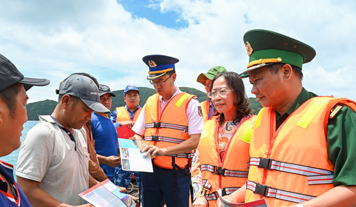 Lực lượng chức năng tuyên truyền vận động ngư dân chấp hành quy định trong đánh bắt thủy hải sản.